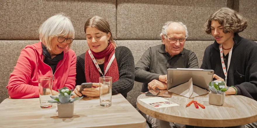 Im Digital-Café bieten wir rund einmal im Monat kostenlose individuelle Beratung durch fachkundige Jugendliche an. Diese kennen die Stolpersteine des digitalen Alltags und unterstützen Sie beispielsweise beim Verfassen von E-Mails, bei der Verwendung von nützlichen Apps wie Google Maps, WhatsApp oder FaceTime sowie bei Zahlungen über Self-Checkout-Kassen in Läden oder dem Kauf eines SBB-Tickets via Smartphone.